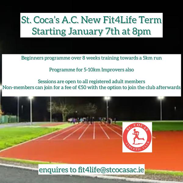 St. Coca's A.C. Fit4Life programme commences January 7th at 8 pm on our track in the Bawnogues in Kilcock. Beginners and Improvers are welcome to join. We have a programme for those training for a 5k or, for those with some running experience, a 10k - enquiries to fit4life@stcocasac.ie